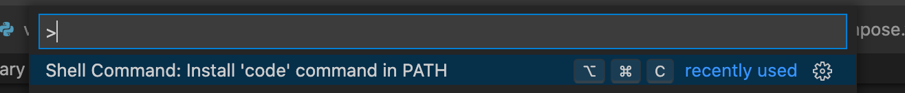 Visual Studio Code에서 code 명령어를 사용하기 위해서는 Visual Studio Code 앱을 열고, Command + Shift + p를 눌러준 다음, 아래와 같이 Shell Command: Install 'code' command in PATH를 설정해주어야 한다.