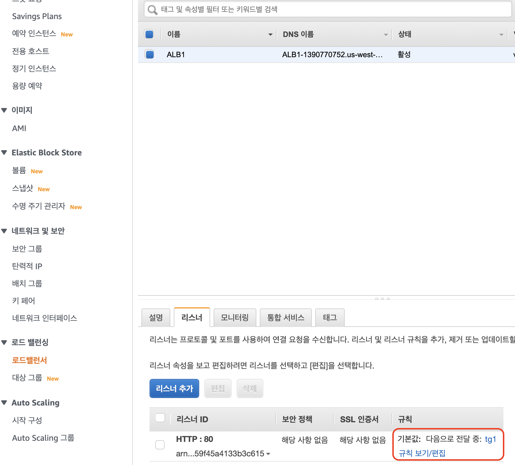 우선, AWS Console 창에서 EC2 를 검색한 후, 로드 밸런싱 아래 로드밸런서를 선택하고, 아래의 리스너 탭을 선택하고 규칙 보기/편집 을 클릭합니다.
