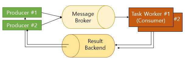 Task Queue는 스레드 또는 머신에 작업을 분산시키기 위한 메커니즘으로 task라는 하나의 작업단위를 입력 받습니다. 전담 워커 프로세스는 새로운 작업을 수행하기 위해 task queue를 지속적으로 모니터링 합니다. Celery는 보통 클라이언트와 워커 사이를 중재하는 브로커를 사용하여 메시지를 통해 통신하며, task를 시작하기 위해 클라이언트는 큐에 메시지를 추가하고, 브로커는 워커에게 메시지를 전달합니다. Celery 시스템은 여러 워커와 브로커들로 구성될 수 있고, 고가용성 및 수평적 확장이 가능합니다.